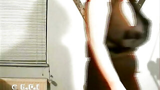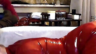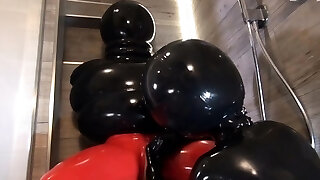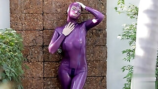 Wanilianna wears a black latex cover, latex dress, latex top, and high heels, but beneath she's wearing layered nylons