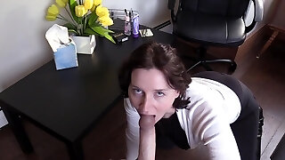 Stepmother enters the office to give a delicious blowjob. Pt Two. I smash her hard on her desk until I cum.