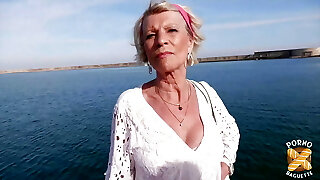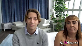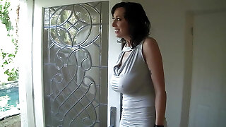 Happy and smiling German brunette milf masturbates her shaved pussy with sex playthings in spunky point of view filmed scene