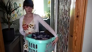 Torrid housewife Lukerya. Fun dinking around in the kitchen while sitting on the washing machine. Bottom view.